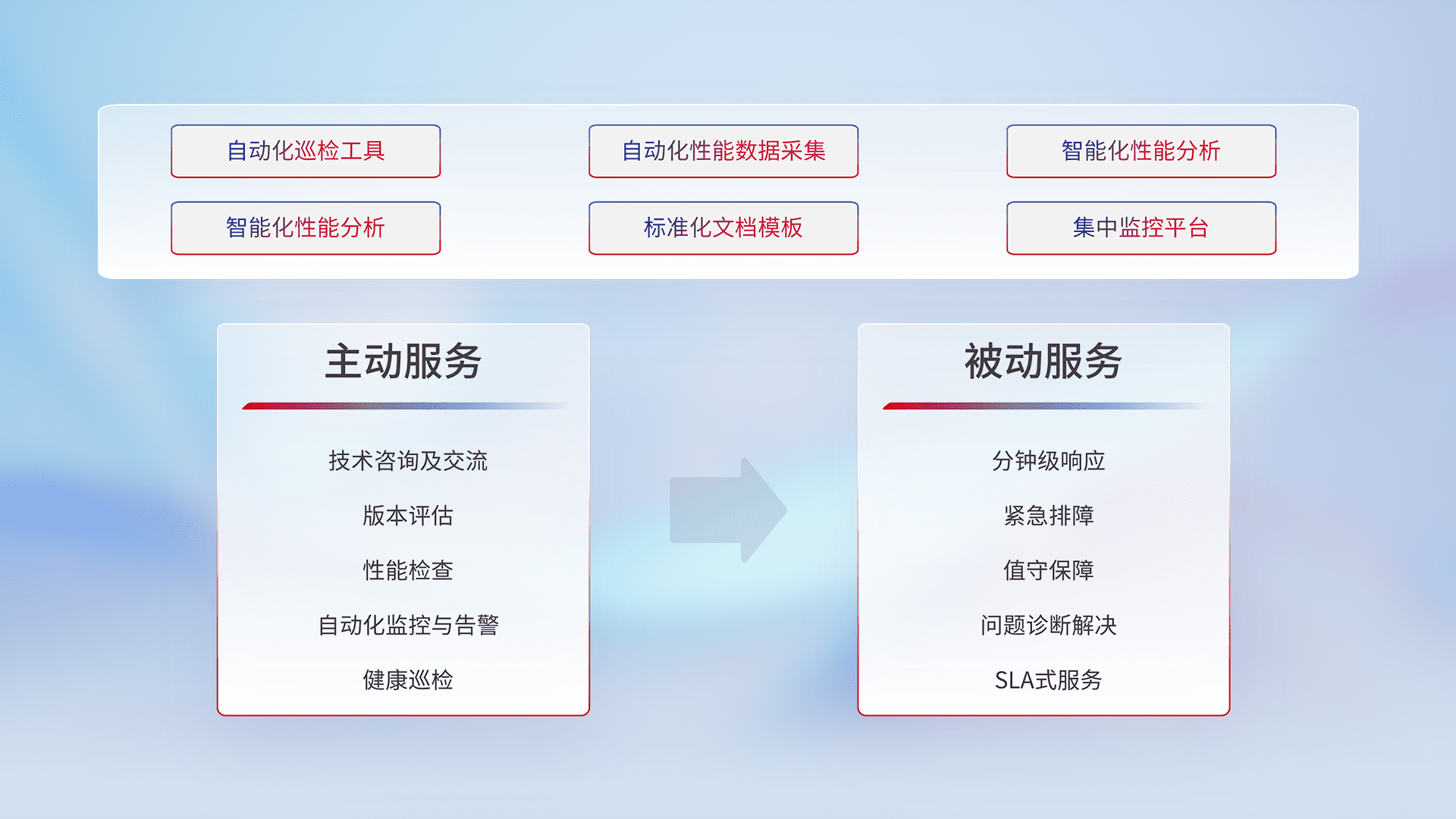 智能化工具和标准化文档,,保障服务质量,,,提供主动服务(包含技术咨询、、、、版本评估、、、、性能检查、、自动化监控与告警、、、健康巡检)和被动服务包含(分钟级响应、、紧急排障、、、值守保障、、、问题诊断解决、、、SLA服务)。。