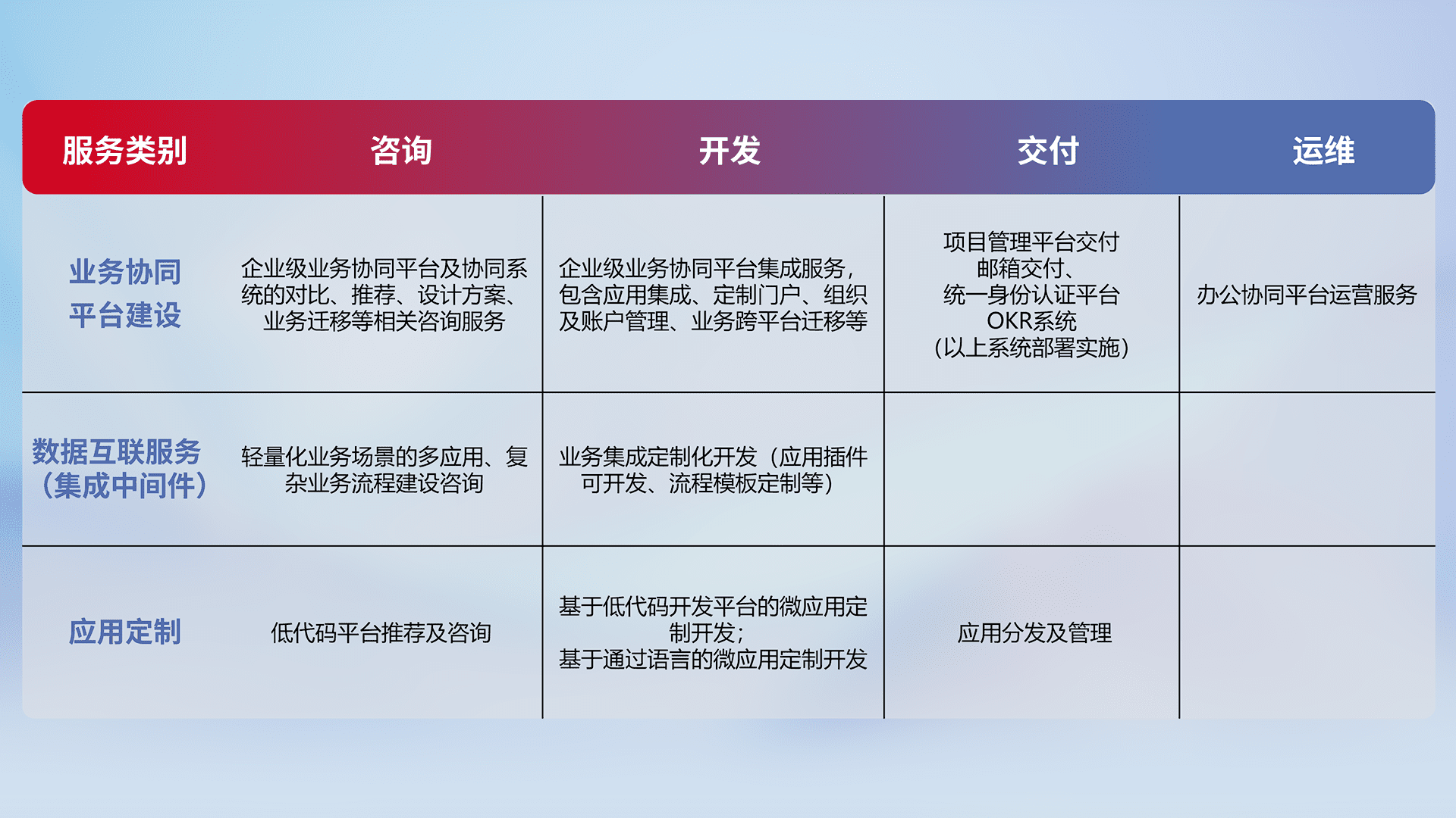 针对钉钉、、、企微、、、IDaas等平台级产品提供产品的规划、、、、方案、、、、交付、、、定制化开发等服务,,,实现如统一协同办公、、智能客户服务、、、、混合会议管理、、智能数据查询、、等业务场景,,,,实现数字化转型。。。